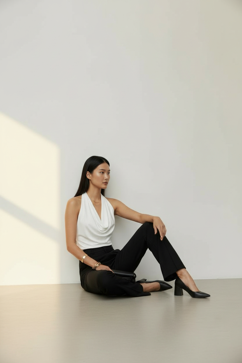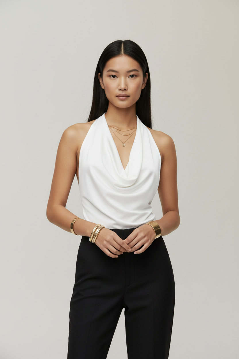Drape kumaş dokusu, vücuda zarif bir şekilde oturur ve akıcı bir siluet oluşturur.