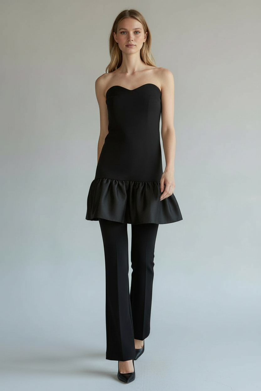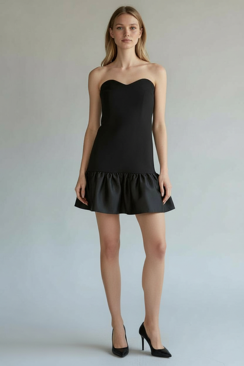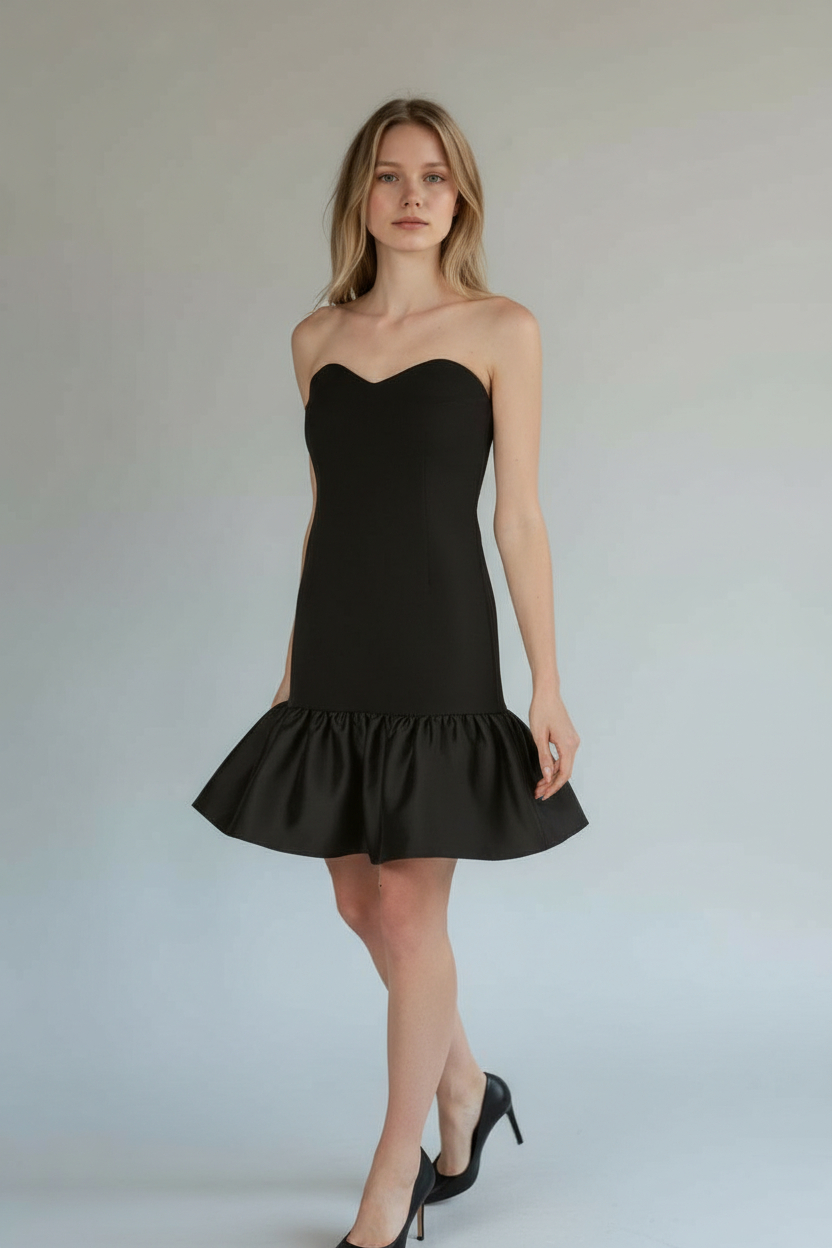 - Straplez kalp yaka siyah elbise, siyah saten büzgü detaylı Uyumlu renkte astarlı ve sırtı gizli fermuarlı. Kumaş ağırlığı: 180gr dır. Ağır kumaş tercih edildiği için elbiselerimiz iç göstermez, elastan olduğu için vücudu toparlayıcı etki sağlar ve içinde rahat hissedersiniz.